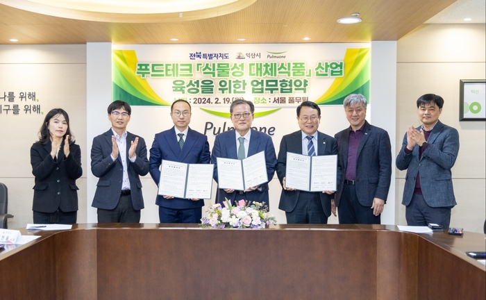 전북자치도와 ㈜풀무원, 익산시는 19일 서울 풀무원 본사에서 ‘푸드테크 식물성대체식품 산업 육성’을 위한 업무협약을 체결했다.