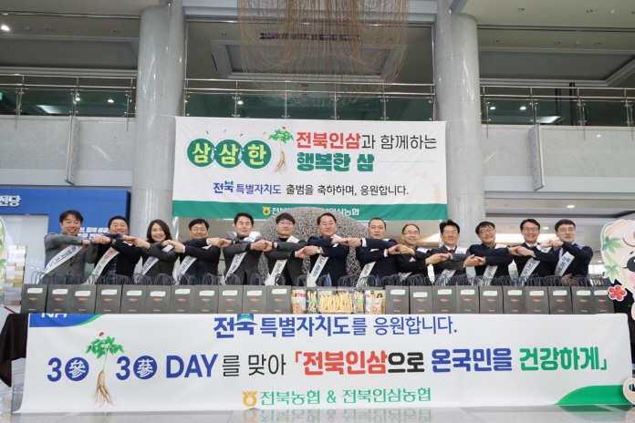 전북농협(본부장 김영일)은 전북인삼농협(조합장 신인성)과 함께 '삼·삼(蔘蔘)데이'를 앞두고 26일 전북특별자치도청에서‘전북 인삼으로 온 국민을 건강하게’를 슬로건으로 인삼소비촉진 행사를 실시했다.