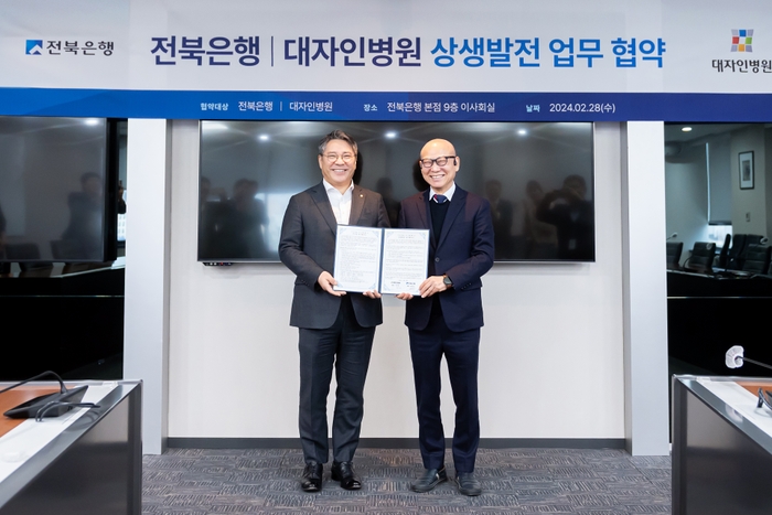JB금융그룹 전북은행(은행장 백종일)은 28일 전북은행 본점 회의실에서 대자인병원과 상호간 상생발전을 위한 업무협약을 체결했다.