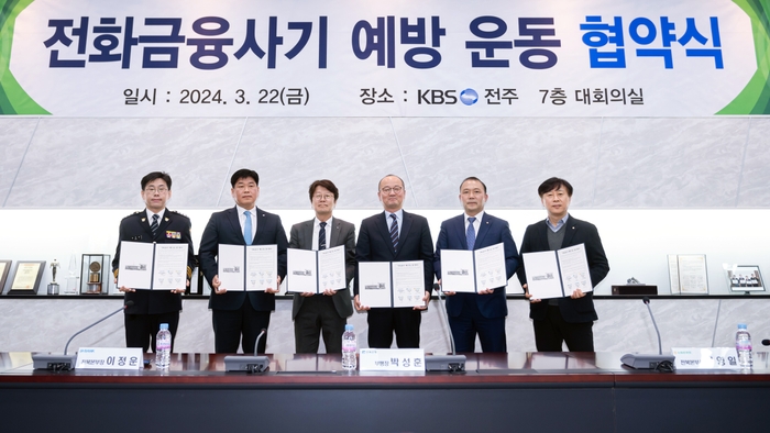 JB금융그룹 전북은행(은행장 백종일)은 KBS전주방송총국에서 전북경찰청, 금감원 전북지원, 농협중앙회, 수협은행 등과 함께 ‘전화금융사기 예방 운동’ 업무협약식을 지난 22일 가졌다.
