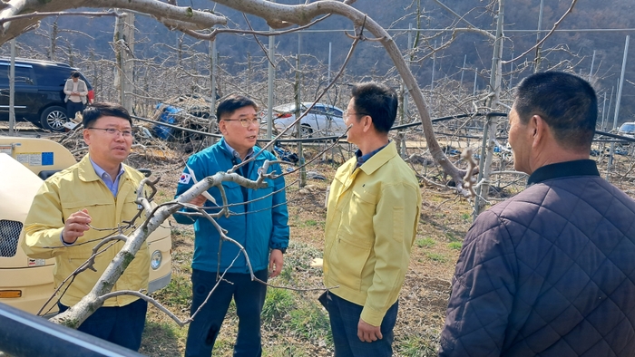 농촌진흥청(청장 조재호) 권철희 농촌지원국장은 3월 22일, 전북특별자치도 무주군 무주읍 사과 재배 농가를 찾아 저온 피해 경감시설과 개화 전 과수화상병 방제 추진 현황을 점검했다.