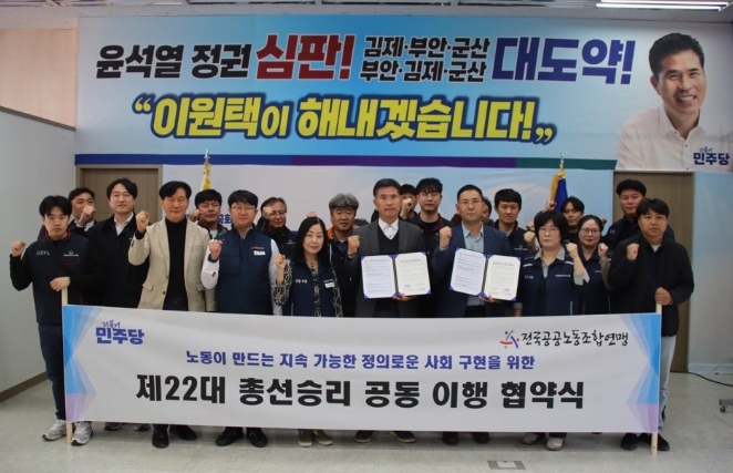 이원택 더불어민주당 군산시김제시부안군을 후보는 지난 1일 한국노총 전국공공노동조합연맹과 노동이 만드는 지속가능한 정의로운 사회구현을 위한 ‘노동·사회분야 7대 핵심 입법과제’에 대해 정책협약을 체결했다.