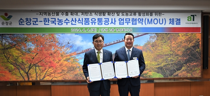 한국농수산식품유통공사(사장 김춘진)와 순창군(시장 최영일)은 지난 4일 순창군 농업기술센터에서 K-푸드 수출 진흥과 저탄소 식생활 확산을 위한 업무협약을 체결했다.