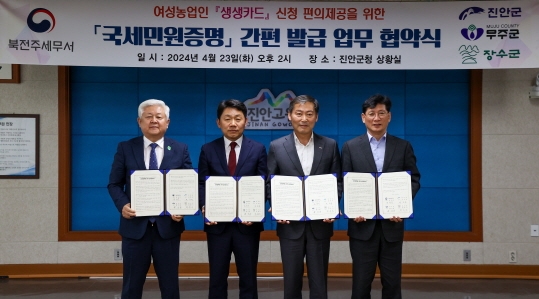 북전주세무서(서장 장성우)와 진안군(군수 전춘성), 무주군(군수 황인홍), 장수군(군수 최훈식)은 23일 진안군청에서 여성 농·어업인 지원 사업인 생생카드 사업과 관련한 업무협약을 체결했다.