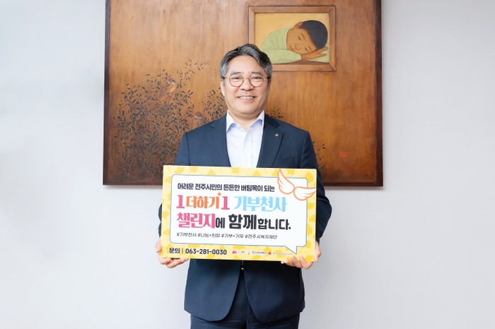 전북은행 백종일 은행장이 어려운 전주시민의 든든한 버팀목이 되는 ‘전주시 복지재단 1더하기1 기부천사 챌린지’에 동참하며 지역사회에 선한 영향력 확산에 나섰다.
