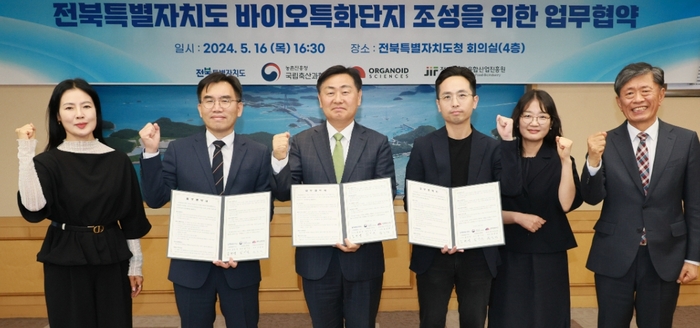 전북자치도가 국립 연구기관인 국립축산과학원과 오가노이드사이언스㈜와 업무협약을 체결하고 특화단지 유치 및 바이오산업 육성을 위한 협력을 강화한다. 전북자치도는 16일 도청 회의실에서 김관영 도지사와 국립축산과학원 임기순 원장, 오가노이드사이언스 유종만 대표 등이 참석한 가운데 전북 바이오 특화단지 조성 협력을 위한 업무협약을 체결했다. 국립축산과학원은 생명공학기술을 축산에 접목해 바이오신약/바이오 장기 연구 등을 통해 미래 성장산업으로 육성하고 있는 연구기관으로, 환경친화적 축산 전환을 통한 국가정책 지원, 동물복지 및 반려동물 연관산업, 생명공학 등 바이오산업 실용화 기술개발 보급 및 연구역량을 바탕으로 지속가능한 축산업 구현을 목표로 하고 있다. 오가노이드사이언스는 국내 최초의 오가노이드 전문 신약개발 혁신기업으로 오가노이드 분야를 선도적으로 이끌고 있으며 전북자치도 및 유관기관들과 지난 두 차례의 협약을 통해 레드바이오 산업 육성에 적극 참여하고 있다. 이번 협약으로 바이오특화단지 활성화를 위한 공동사업 발굴과 동물 유래 오가노이드 뱅크 및 이를 기반한 반려동물 치료제 등 플랫폼 구축에 대한 협력을 통해 전북 바이오산업 성장에 큰 도움이 될 것으로 보인다. 협약의 주요 내용은 ▲바이오 특화단지 활성화 위한 공동사업 발굴 및 연계협력 추진 ▲바이오분야 R&D 과제 발굴 및 추친 ▲동물 유래 오가노이드 뱅크 구축 협력 및 이를 기반한 반려동물 치료제 등 플랫폼 구축 협력 ▲지역 소재·장비 인프라 공유 및 협력 등을 담고 있어 향후 바이오산업 집약화에 큰 역할을 할 것으로 기대된다. 김관영 지사는 “동물용 의약품 시장을 기반으로 인체를 위한 첨단바이오 의약품 시장으로 확대 발전시키고, 바이오특화단지 지정이 성사되면 오가노이드 기반 바이오 생태계 구축을 통해 생명경제도시로의 전환을 가속화 시킬 수 있을 것이다”고 강조했다. /유연순 기자
