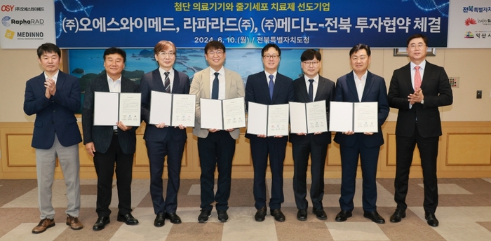 전북자치도에 대한 바이오 관련 앵커기업들의 관심과 투자가 이어지고 있는 가운데 첨단 의료기기 제조기업과 줄기세포를 활용한 신경계 질환 치료제를 연구하는 첨단 기업들이 전북에 둥지를 틀었다. 전북자치도는 10일 도청 회의실에서 김관영 도지사를 비롯해 김인태 전주부시장, 허전 익산부시장, 윤여봉 전북경진원장, 이세철 오에스와이메드 대표, 임영경 라파라드(주) 대표, 주경민 메디노 대표 등이 참석한 가운데 투자협약을 체결했다고 밝혔다. 3개 기업의 투자협약 금액은 총 2백10억원이며 오에스와이메드와 라파라드는 전주에, 메디노는 익산3산단에 둥지를 틀어 총 1백45개의 양질의 일자리를 창출하게 된다. 투자협약을 체결한 오에스와이메드는 지난 2011년도에 설립된 기업으로 카테터, 튜브 중심의 의료기기를 제조하고 있으며 지난해 25억원의 매출을 달성하는 등 지속 성장 중이다. 오에스와이메드는 지난 2011년 정부 지원을 받아 국내 최초로 의료용 튜브 압출을 시작해 부처과제를 지속 수행하며 안정적으로 R&D자금을 지원받아 제품 연구개발에 매진 중인 카테터 분야에서는 국내 최고의 기업이다. 또한 라파라드는 암 근접치료와 양성자 치료 제품을 개발하는 기업으로 향후 원대병원에서 건립 예정인 양성자치료센터와 협업해 양성자 치료 제품 개발, 판매 등으로 기업 성장이 기대된다. 익산에 투자를 약속한 메디노는 2018년 설립, 줄기세포를 활용한 신경계 질환 치료제를 연구 중인 기업으로 최근에는 반려동물용 줄기세포치료제 개발 분야까지 사업범위를 확장하고 있다. 메디노는 동물바이오에 강점이 있는 익산에서 향후 반려동물 관련 치료제 개발과 연계해 동물바이오산업 육성 등에 기여할 것으로 기대된다. 지난 2월말과 4월에 바이오특화단지와 기회발전특구를 신청한 전북자치도에는 이처럼 바이오 기업들과 기관들의 지속적인 관심과 투자가 이어지고 있는 상황. 전북자치도는 바이오산업을 미래 먹거리 산업으로 육성하기 위해 국가에서 공모하는 바이오특화단지와 바이오특구를 포함한 기회발전특구를 신청하고 관련 기업들을 꾸준히 유치하고 있다. 지금까지 전주, 익산, 정읍을 중심으로 넥스트앤바이오, 제이비케이랩, 인핸스드바이오 등 국내 최고기술 선도기업 7개사가 2천2백억원 규모의 투자를 약속한 바 있다. 또한 국내 바이오 관련 46개 기관 및 하버드의대 나노메디슨연구소, 존스홉킨스 의과대학 미세생체조직시스템 연구센터 등 해외 바이오관련 연구소 등과 협력을 위한 업무협약 체결이 이뤄졌다. 전북자치도는 이를 기반으로 지난 5월 29일 생명경제 바이오 얼라이언스 출범식을 개최하는 등 산․학․연․병․관 등과 협력체계 구축 하고 바이오특화단지 지정을 위한 기반을 견고히 다져가고 있다. 김관영 지사는 “전북자치도를 바이오산업 거점으로 키우기 위해 앞으로도 관련 기업 유치는 물론 바이오산업 육성을 위한 다양한 정책을 추진할 것”이라며 “오늘 투자한 기업들이 전북에서 성공할 수 있도록 적극 지원하겠다”고 말했다. /최준호 기자