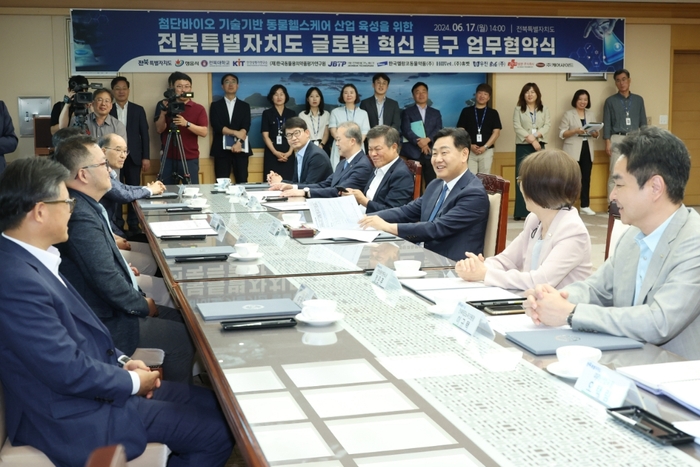 전북자치도는 미래기술 분야의 신제품 개발과 해외 진출을 위해 규제‧실증‧인증‧허가‧보험 등을 지원하는 ‘글로벌 혁신 특구’ 지정 준비에 박차를 가하고 있다. 글로벌 혁신특구는 제도가 기술을 따라가지 못하는 첨단분야를 지원해 글로벌 경쟁력을 강화하기 위한 사업으로, 역량있는 다수 중소기업이 지역에서 가동돼야 한다. 이에 전북자치도는 17일 도청 회의실에서 도와 정읍시, 전북대학교, 안전성평가연구소, (재)한국동물의약품평가연구원, 전북테크노파크, 한국엘랑코동물약품(주), ㈜휴벳, 우진비앤지(주), 한국썸벧(주), ㈜케어사이드와 글로벌 혁신특구 공모 대응을 위한 동물헬스케어 산업 육성 업무협약을 체결했다. 협약식에는 김관영 도지사를 비롯 이학수 정읍시장, 양오봉 전북대 총장, 정은주 안전성평가연구소장, 김원일 한국동물용의약품평가원장, 이규택 전북테크노파크원장, 정현진 한국엘랑코동물약품(주) 대표, 오홍근 ㈜휴벳 대표이사, 이성호 우진비앤지(주) 연구소장, 김달중 한국썸벧(주) 대표이사, 유영국 ㈜케어사이드 대표이사 등이 참석했다. 협약기관들은 앞으로 동물헬스케어 분야 규제특례를 통해 기술개발, 기업유치‧지원, 실증 지원 체계를 마련하고 초격차기술 선점 및 글로벌 시장 진출을 앞당기기 위해 상호 협력해 나가기로 했다. 이에 앞서 전북자치도는 올해 1월부터 도‧기관‧기업 등이 모여 전략기획 회의를 거쳐 사업계획을 지속 보완해 왔으며 반려동물 분야‧규제분야 전문가 자문 및 중기부 사전 컨설팅을 거쳐 사업계획 완성도를 높이고 있는 상황이다. 도가 추진하는 ‘첨단 바이오 기술기반 동물헬스 케어’ 글로벌 혁신특구는 ▲동물용 의료(동물용의약품, 의료기기) ▲기능성 펫푸드 ▲동물관리 소프트웨어(AI기술기반 ICT융합 기술) 3개 분야 세부규제를 발굴하고 국내‧해외 실증 및 인증을 지원해 동물 헬스케어 관련 유니콘기업 발굴‧육성, 실증 거점조성을 목표로 하고 있다. 또한, 농생명 소재 활용 반려동물용의약품 및 기능성 사료 개발 HW, SW 기구축, 우수한 비/임상 인프라 등 최적화된 농생명바이오 기반 강점을 활용, 전북형 동물헬스케어를 구축할 계획이다. 김관영 지사는 “동물 헬스케어 산업의 질적 성장과 함께 아시아 시장에서의 경쟁력 강화를 위한 발판이 될 것으로 기대한다”며 “동물용의약품 산업 1번지를 향한 마중물이 될 수 있도록 글로벌 혁신특구 지정에 최선을 다하자”고 강조했다. /유연순 기자