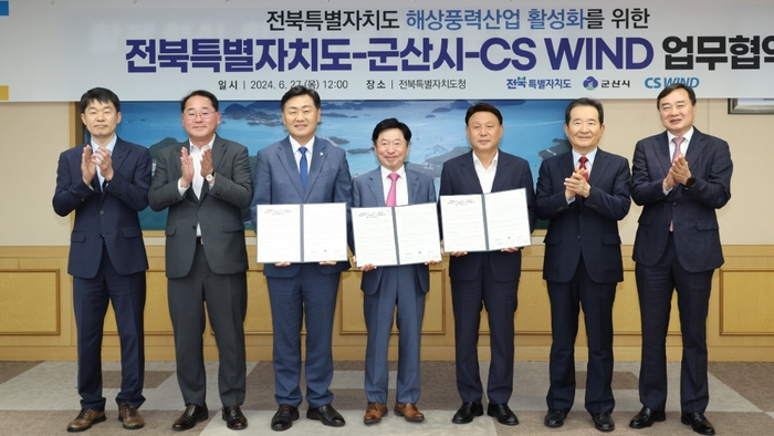 전북자치도 내 해역에서 친환경 풍력에너지를 생산할 수 있는인프라 구축이 속도를 낼 것으로 기대된다. 전북자치도는 27일 도청 회의실에서 김관영 도지사를 비롯 김성권씨에스윈드 회장, 강임준 군산시장 등이 참석한 가운데 전북자치도해상풍력 및 신재생에너지 사업 협력을 위한 업무협약을 체결했다. 이번 협약은 해상풍력 타워 및 하부구조물 생산공장 구축과 함께도내에서 생산하는 해상풍력 제품이 도내 해역의 해상풍력단지에적극 활용되도록 협력한다는 내용을 담고 있다. 협약에 따라 도와 군산시는 앞으로 건설될 해상풍력단지(서남권2.4GW, 군산시 1.6GW 등)에 도내 생산 제품이 적용될 수 있도록 노력하고생산시설 운영과 관련 인력 고용, 지역경제 활성화에기여할 수 있는 상생협력 지원, 씨에스윈드의 생산시설 조성에 필요한행정적 지원 등에나서기로 했다. 씨에스윈드는 3백50억원 가량의 자금을 투입해 군산 산단 내 10만㎡(약 3만평)규모의 풍력타워 및 하부구조물 등 신재생에너지 기자재를 생산할 수 있는생산 기반을 구축할 계획이며 해상풍력 기자재 납품 시기 등을 감안, 오는 27년부터 공장구축 사업에 착수해 30년까지는 관련 기자재생산을목표로 하고 있다. 또한 씨에스윈드는 도내 인근 해역·내륙에서 추진하는 신재생에너지단지 개발에 필요한 기자재를 도내에서 생산할 수 있도록 노력하며 그 일환으로 씨에스윈드가 100% 출자한 신재생에너지 개발사인 씨에스에너지의 본점 소재지를 전북도로 이전했다. 이를 통해 도내에서는 1백50여 명의 고용 창출과 풍력단지 개발 조성에 따른연관 산업 효과 등 생태계 마련에 크게 기여할 것으로 기대되고 있다. 도는 또 이번 협약을 계기로 해상풍력 관련 기업들의 도내 이전을적극 유도하고 관련기업 육성 및 핵심인력 인력 양성 등 인프라 조성에행정력을 집중하겠다는 방침이다. 김관영 도지사는 “씨에스윈드가 성공적으로 전북에 정착할 수 있도록 군산시와 함께 적극 지원하겠다”며 “도 차원에서도 해상풍력산업 생태계를 조속히 구축해 전북이 해상풍력 산업의 메카로도약할 수 있도록 모든 노력을 다하겠다”고 밝혔다. 한편 전북자치도는 고창, 부안 해역에 총 14조7천억원이 투자되는 2.46GW 규모의 서남권 해상풍력 발전단지와 군산에 1.6GW의 해상풍력발전단지를 오는 2030년까지 조성할 계획이다. /군산=지송길 기자