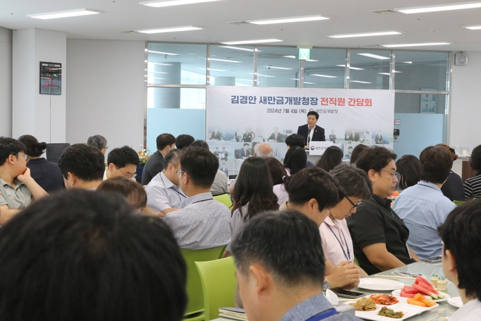 새만금개발청(청장 김경안)은 최근 새만금의 괄목상대한 성과에 대해 직원들을 치하하고, 동북아 경제허브로 도약을 다짐하는 간담회를 개최했다고 밝혔다.