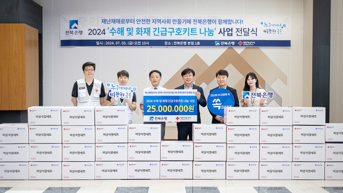 JB금융그룹 전북은행(은행장 백종일)은 5일 본점 1층 로비에서 2024 수해 및 화재 긴급구호키트 나눔 전달식을 실시했다고 밝혔다.