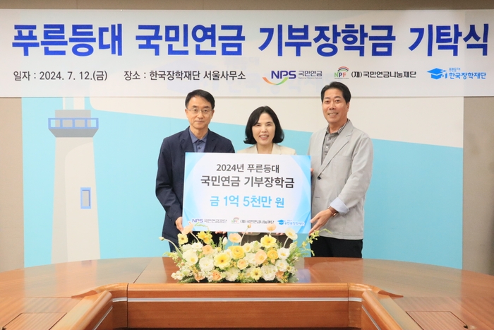 국민연금공단(이사장 김태현)과 국민연금나눔재단(이사장 김신열)은 12일 한국장학재단에 ‘푸른등대 기부장학금’ 1억 5천만 원을 기부했다.