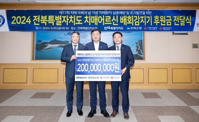 JB금융그룹 전북은행(은행장 백종일)은 20일 전북특별자치도청 도지사실에서 2024 전북특별자치도 치매어르신 배회감지기 지원사업 후원금 2억원 전달식을 실시했다고 밝혔다.