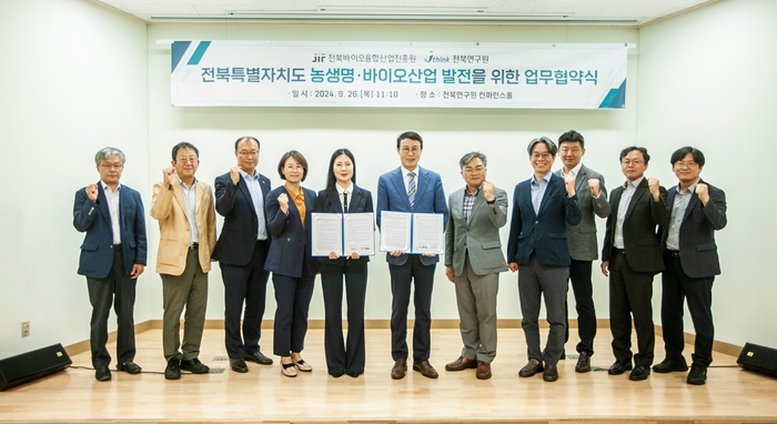 전북바이오융합산업진흥원(원장 이은미, 바이오진흥원)은 26일, 전북연구원과 농생명·바이오산업 발전 및 미래 성장동력 창출을 위한 업무협약을 체결했다.