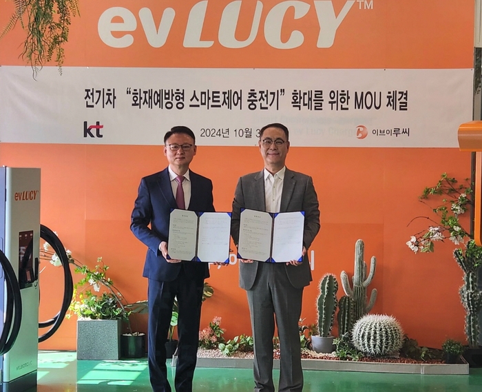 KT 전남전북광역본부(본부장 지정용 전무)가 30일 ㈜이브이루씨와 전기자동차 화재예방형 스마트제어 충전기를 확대하고 통신 인프라 지원을 위한 업무협약을 체결했다고 밝혔다.