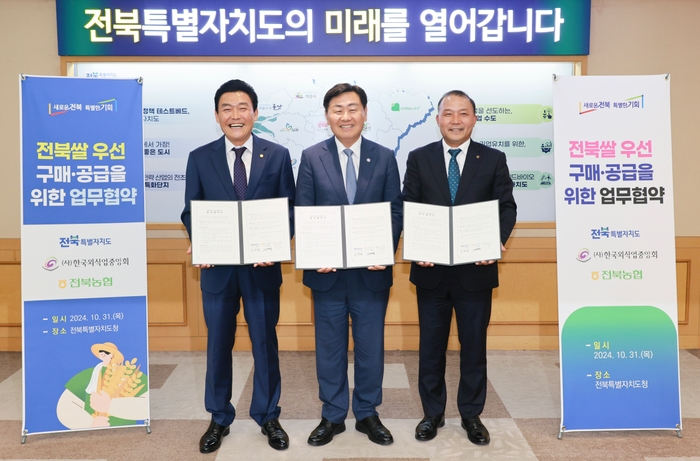 전북자치도는 31일 도청에서 농협전북본부(본부장 김영일), (사)한국외식업중앙회(회장 전강식)와 함께 고품질 전북쌀의 전국 공급 확대를 위한 상생 업무 협약을 체결했다고 밝혔다. 이번 협약을 통해 전국 약 33만6천여 한국외식업중앙회 일반음식점 회원을 대상으로 운영하고 있는 온라인 플랫폼에 전북쌀 판매업체가 입점해 고품질 전북쌀을 판매할 수 있게 된다. 주요 협약 내용은 ▲한국외식업중앙회 회원업소의 전북쌀 우선구매에 관한 홍보 ▲연중 안정적인 전북쌀 공급 ▲전북쌀 구매와 공급 활성화를 위한 정책 협력이 포함된다. 김관영 도지사는 “오늘 협약이 전북 쌀 농가와 외식업체 간의 상생 모델로 자리 잡아 지속적인 성장이 이어지기를 기대한다”며 “앞으로도 양 기관과 긴밀히 협력해 전북 쌀 산업 발전과 판로 확대를 위해 최선을 다하겠다”고 밝혔다./최준호 기자