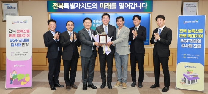 전북자치도는 도내 농특산물 판로 확대에 기여한 ㈜BGF리테일에 감사패 전달했다. 도는 19일 도청 회의실에서 김관영 도지사와 민승배 BGF리테일 대표이사, 생산자 단체인 서재필 고창황토배기청정고구마연합 대표 등이 참석한 가운데 전북자치도와 BGF리테일 간의 협력 관계를 기념하는 자리에서 감사패를 전했다.
