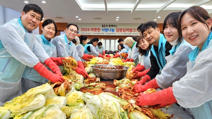 KT 전남전북광역본부(본부장 지정용 전무)가 27일 지역아동센터전북지원단, 전주새희망로터리클럽, ㈜자연머금과 함께 전북지역의 어려운 이웃들의 겨울나기를 위한 ‘2024년 따뜻한 겨울나기 김장나눔 봉사활동’을 진행했다고 밝혔다.