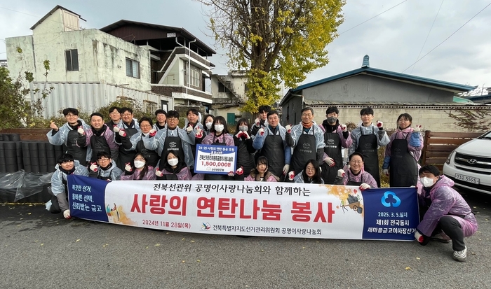전북특별자치도선거관리위원회 봉사단체인 ‘공명이사랑나눔회’는 11월 28일(목) 전주시 완산구 중앙동 일대의 에너지 취약 가정에 연탄 1,760여장을 전달했다고 밝혔다.
