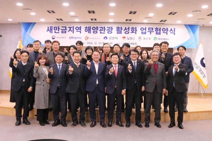 새만금개발청(청장 김경안)은 12일 2025년 새만금 해양레저관광 활성화를 위해 전북특별자치도(도지사 김관영), 한국관광공사(사장직무대행 서영충), 군산시(시장 강임준), 김제시(시장 정성주), 부안군(군수 권익현), 새만금개발공사(사장 나경균)와 업무협약을 체결했다고 밝혔다.