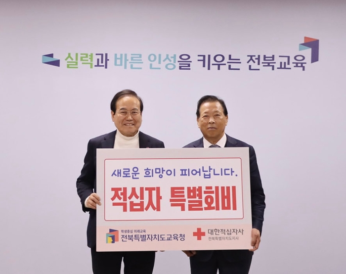 대한적십자사 전북특별자치도지사(회장 이선홍)은 전북특별자치도교육청(교육감 서거석)이 16일 교육청에서 2025년도 적십자 특별회비를 전달했다고 밝혔다.