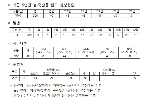 현제까지 도내 농·축산물 절도 피해는 지난 7월 말 기준 총 17건으로 약 800~900만 원 정도의 피해가 발생 됐으며, 특히 농산물 절도 피해를 입은것으로 파악됐다.