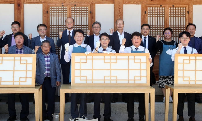 전주시와 문화재청, 신협중앙회는 20일 경복궁 흥복전에서 우범기 전주시장과 최응천 문화재청장, 김윤식 신협중앙회장 등 40여 명이 참석한 가운데 한국의 아름다운 문화유산인 경복궁을 지속 보존하기 위한 ‘경복궁 창호 전주한지 바르기 행사’를 진행했다.