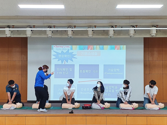 이날 교육 내용은 ▲골든타임의 중요성 ▲자동제세동기 사용방법 ▲교육용 마네킹을 이용한 흉부 압박 실습 위주로 진행되었다.