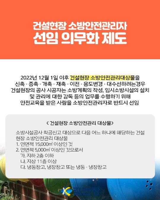 소방서 관계자는 “법이 시행됨에 따라 소방안전관리자를 선임하지 않거나 기간 내에 선임 신고를 하지 않은 건설 현장 관계자가 벌칙 또는 과태료 처분을 받지 않도록 내용을 숙지 및 자격조건을 미리 확인하길 바란다”고 전했다.