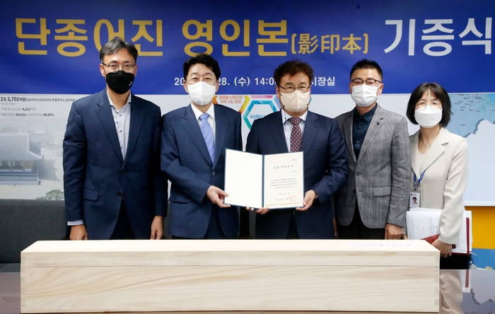전주시와 영월군은 28일 전주시장실에서 우범기 전주시장과 최명서 영월군수 등 양 시·군 관계자들이 참석한 가운데 ‘표준영정 100호 단종어진 영인본(影印本) 기증식’을 가졌다.