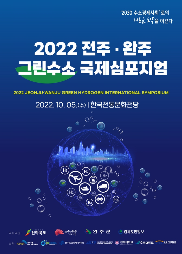 전주시와 완주군, 전북도는 오는 10월 5일 오전 10시 한국전통문화전당 공연장에서 ‘2022 전주·완주 그린수소 국제심포지엄’을 개최한다.