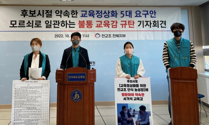 전국교직원노동조합 전북지부(지부장 송욱진·이하 전교조)는 17일 오전 전북교육청 브리핑실에서 기자회견을 열고 서거석 교육감이 후보 시절 약속한 '교육정상화 5대 요구안'을 이행하라고 촉구했다.