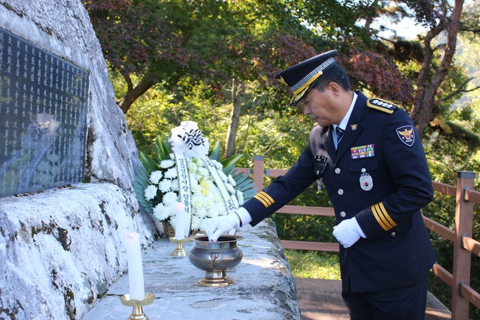 정읍경찰서(서장 황동석)는 20일 오전 제77주년 경찰의 날을 맞아 정읍시 칠보면에 위치한 칠보 충혼탑을 찾아 추념식을 갖고 순국선열과 호국영령의 고귀한 희생정신을 기렸다. 이날 추념식에는 황동석 서장을 비롯해 각 과장과 칠보파출소장 등 11명이 참석해 충혼탑을 참배했다.
