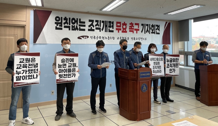 전국공무원노동조합 전북교육청지부(지부장 강주용·이하 공노조)는 1일 전북교육청 브리핑실에서 기자회견을 열어 새로 신설되는 '학교안전과'의 과장 보직을 서기관 배치 계획에서 장학관으로 배치하게 된 조직개편을 철회하라 요구했다.