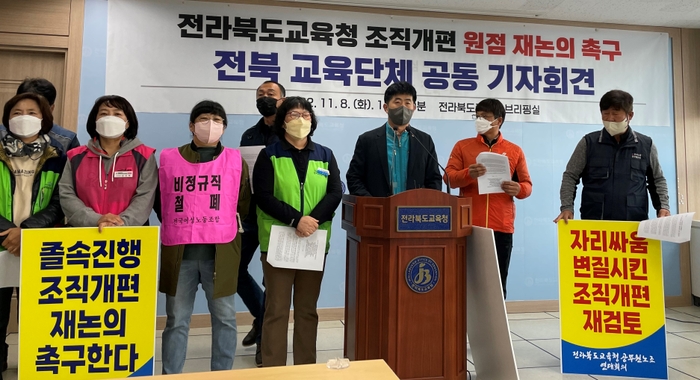 전북교육단체(전국교직원노동조합 전북지부·전국공무원노동조합 전북교육청지부·전국여성노동조합전북지부 등 9개 단체)는 8일 오전 전북교육청 브리핑실에서 교육주체들의 의견수렴과 토론의 과정 없이 추진된 조직개편안에 대해 기자회견을 열고 교육단체들과 처음부터 전면 재논의할 것을 촉구했다.