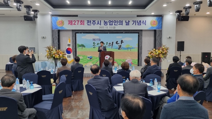 ‘전주시 농업인의 날 기념행사’가 11일 전주지역 농업인단체 회원 등 250여 명이 참석한 가운데 아름다운컨벤션웨딩에서 열렸다.
