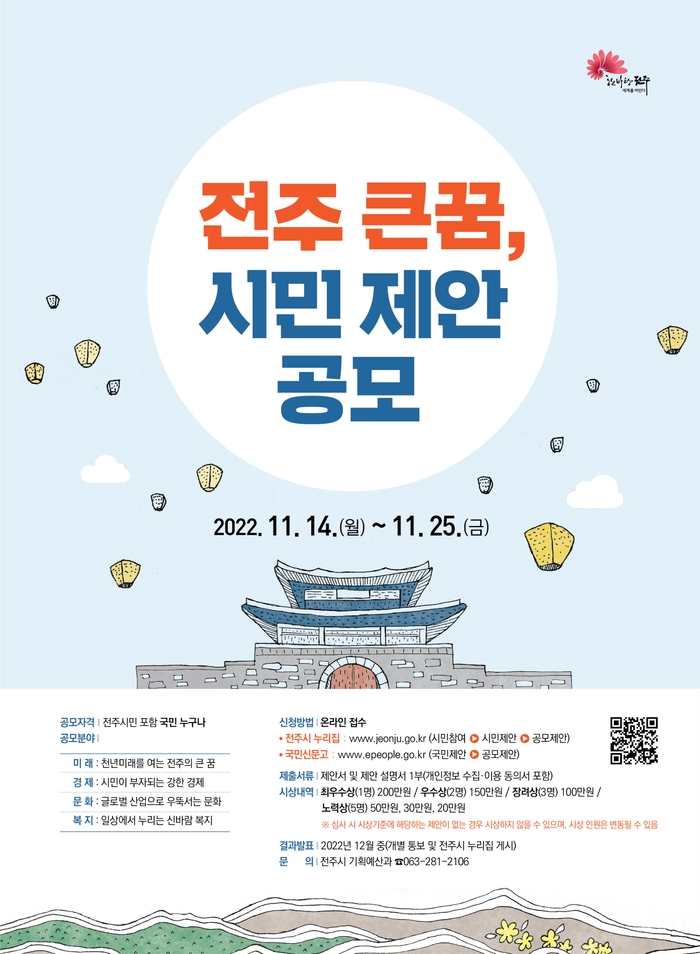 이번 공모에는 전주시 발전에 관심있는 자면 누구나 참여할 수 있으며, 공모주제는 ‘전주 큰꿈, 시민 제안 공모’이다.