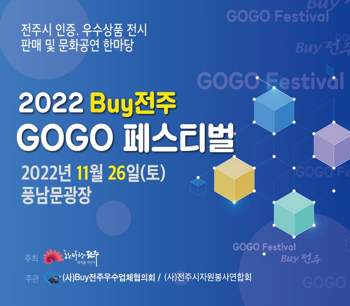 전주시와 (사)바이전주우수업체협의회(회장 전상문), (사)전주시자원봉사연합회(회장 최유)는 오는 26일 오전 11시, 풍남문 광장 일원에서 ‘Buy전주 GOGO 페스티벌’을 개최한다.