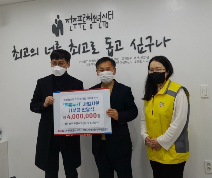 지난 21일, 한국도로공사서비스에서 전주푸른여자단기청소년쉼터 입소 청소년들이 문화적 소외 현상을 겪지 않고, 건강한 사회구성원으로 성장할 수 있도록 돕는데 필요한 지원금 사백만 원을 기부했다.