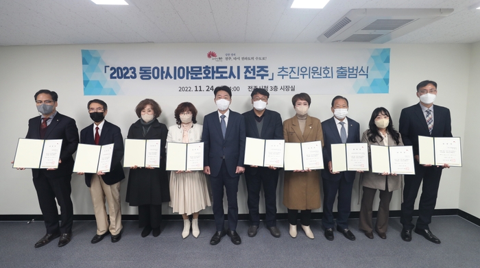 시는 24일 전주시장실에서 우범기 전주시장과 2023 동아시아문화도시 추진위원회 위원 등 15여 명이 참석한 가운데 글로벌 문화관광도시 전주의 문화적 우수성을 알리고, 한·중·일의 다양한 문화예술 교류사업의 원활한 추진을 도모하기 위한 ‘2023 동아시아문화도시 추진위원회 출범식’을 가졌다.