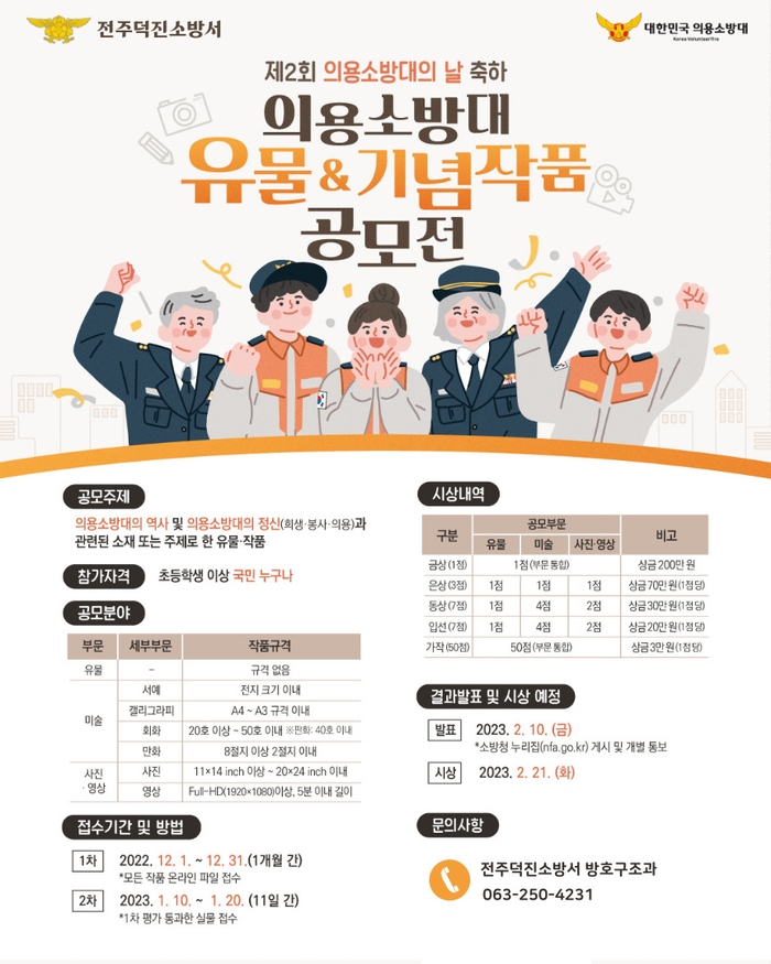 전주덕진소방서 강남섭 방호구조과장은 “의용소방대의 희생과 정신을 기리고자 마련된 이번 공모전에 다양한 미술 작품과 유물이 나올 수 있도록 많은 관심과 적극적인 참여 당부드린다”라고 전했다.