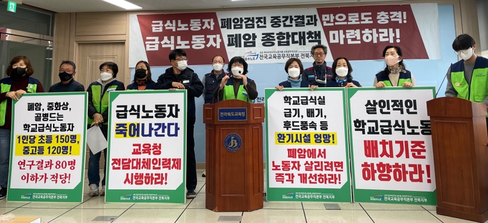 교육공무직노조 전북지부는 "올해 전국에서 실시된 급식노동자 폐 CT 검사 중간결과에서 4명 중 1명이 폐 이상 소견을 받았다"며 "검사 대상이 대부분 55세 이상 10년 이상 근무자에 국한된 결과일 뿐만 아니라 경기, 충북, 경남의 결과는 취합되지 않았다"고 말했다.