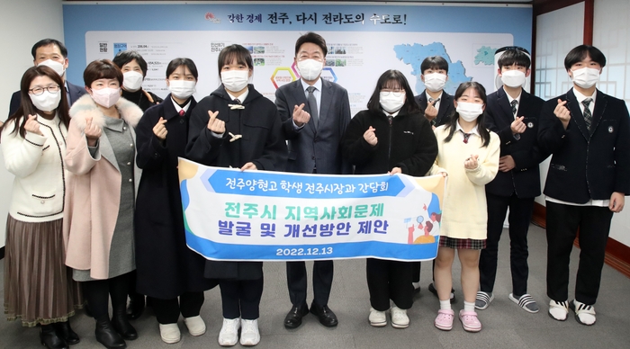 우범기 시장은 13일 전주시장실에서 양현고등학교 학생 7명과 담당교사, 전주교육지원청 장학사, 마을전문가 등 10명을 초청해 학생들이 준비한 전주지역에 대한 이해 및 탐구 활동 결과와 의견을 청취하고 학생들을 격려하는 시간을 가졌다.