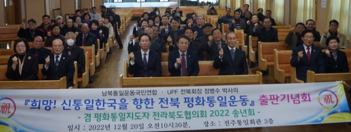 남북통일운동국민연합?UPF 전북회장 정병수 박사의 ‘희망! 신통일한국을 향한 전북 평화통일운동’ 출판기념회 및 평화통일지도자 전북협의회 2022 송년회가 20일 오전 전주통일회관 3층 대강당에서 도내 각계지도자 1백여명이 참석한 가운데 열렸다.