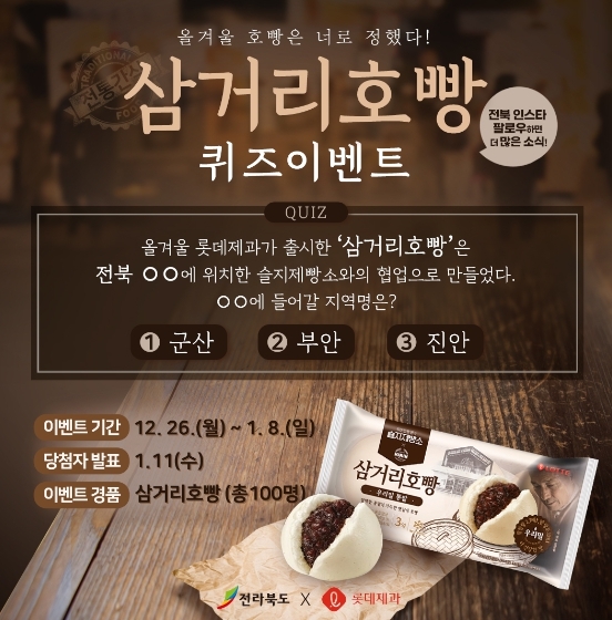 전북도가 롯데제과와 손잡고 지역 특산품 알리기에 나섰다. 부안 ‘슬지제빵소’와의 협업으로 출시한 롯데제과 ‘삼거리 호빵’ 온라인 홍보를 위해 전북도와 롯데제과 SNS에 공동 이벤트를 추진한다. ‘올겨울 호빵은 너로 정했다!’를 주제로 기획된 이번 이벤트는 26일부터 내년 1월 8일까지 전북도와 롯데제과 인스타그램 계정에서 동시 진행된다. 참여 방법은 전북도와 롯데제과 공식 인스타그램을 찾아가 최근 롯데제과가 출시한 ‘삼거리 호빵’ 협업 업체인 ‘슬지제빵소’의 지역명을 댓글로 남기면 된다. 이벤트 참여자 중 정답을 맞춘 1백명을 추첨해 ‘삼거리 호빵’을 경품으로 제공한다. 전라북도 인스타그램 계정(@jeonbukstar, 팬 5.4만), 롯데제과 인스타그램 계정(@lotte_sweet_sta, 팬 20.6만). 롯데제과가 최근 출시한 ‘삼거리 호빵’은 도내 대표 관광지이자 맛집 중 하나인 부안 슬지제빵소와의 협업을 통해 만들어졌으며 슬지제빵소의 노하우를 담아 호빵의 쫄깃함과 담백함을 살린 게 특징이다.
