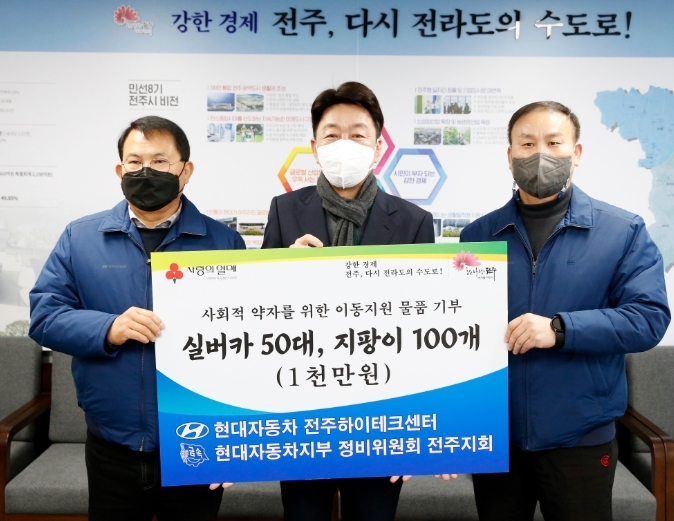 현대자동차 전주 하이테크센터 노사(센터장 채병두, 노조지회장 이동하)는 27일 어려움을 겪고 있는 사회적 약자를 위해 사용해달라며 1000만 원 상당의 장애인 이동지원 물품을 전주시에 기부했다.
