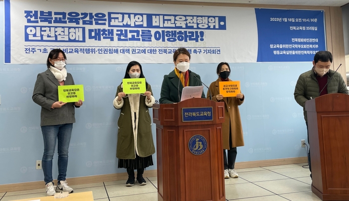 전북교육시민단체들은 18일 오전 전라북도교육청 브리핑실에서 기자회견을 열고 전주의 한 초등학교에서 학생 인권을 침해한 교사에 대한 학생인권심의위원회의 권고 이행을 전북교육감에게 촉구했다.