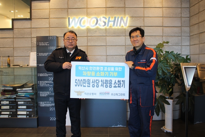 익산소방서(서장 구창덕)는 지난 30일 ㈜우신피그먼트의 사회적 공헌 사업의 일환으로 5,000천원 상당의 차량용 소화기를 기부 받았다고 전했다.