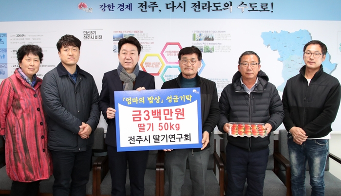전주시 딸기연구회(회장 김경완)는 8일 전주시의 ‘밥 굶는 아이 없는 엄마의 밥상’ 지원을 받는 아동·청소년을 위한 성금 300만 원과 농가들이 직접 재배한 딸기 50㎏(500g/100박스)를 기부했다.