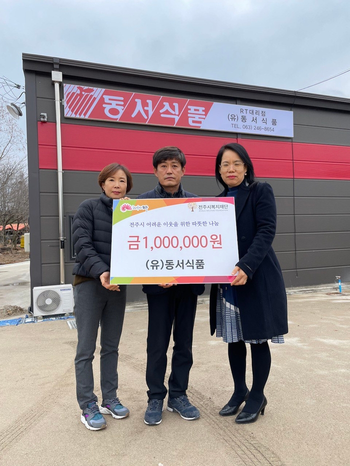 (유)동서식품(대표 권일수)은 10일 전주시복지재단 전주사람(이사장 윤방섭)에 혹한기 추위로 힘든 전주시민을 위해 사용해달라며 성금 100만 원을 기부했다.